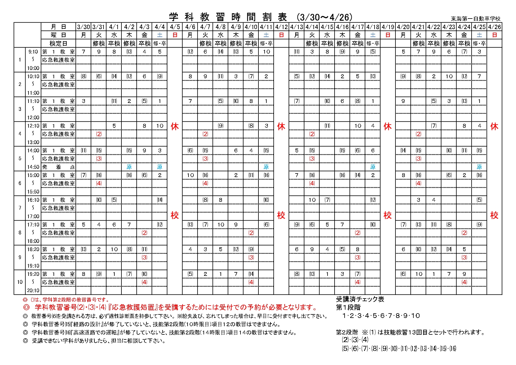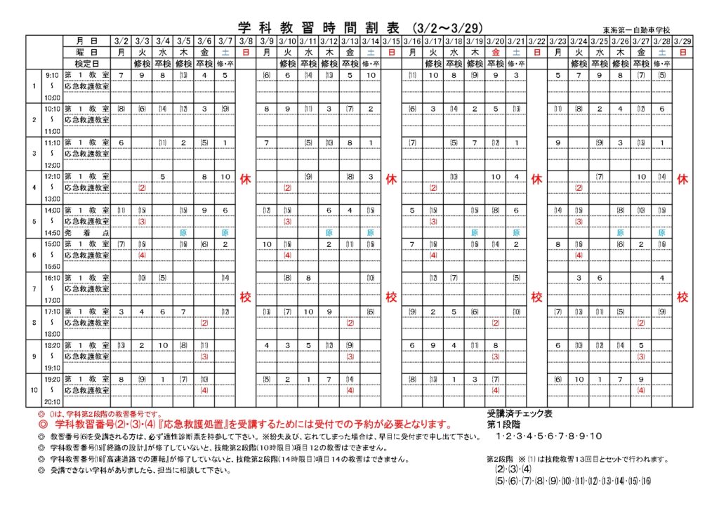 ◎学科教習番号(2)(3)(4)「応急救護処置」を受講するためには受付での予約が必要となります。