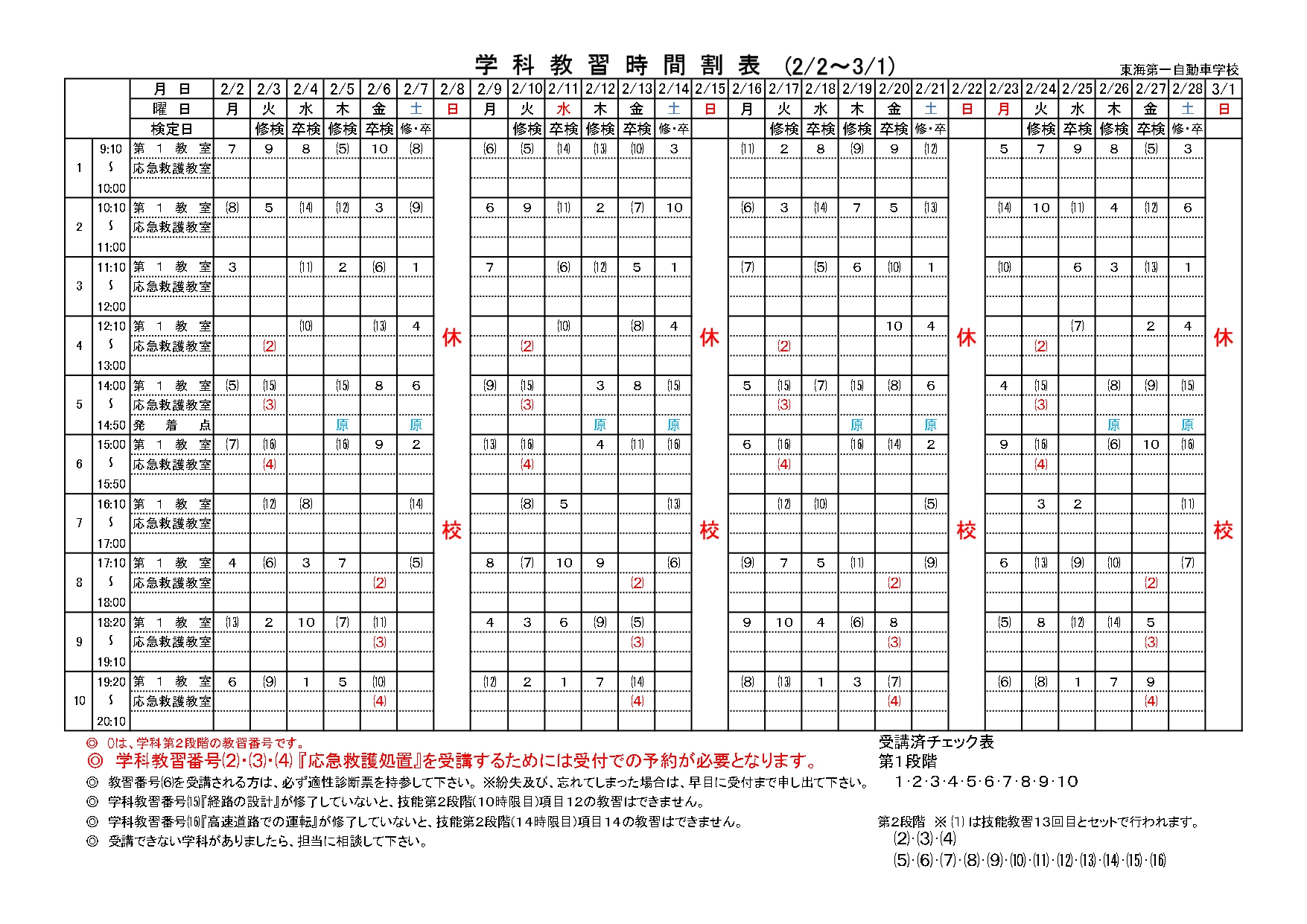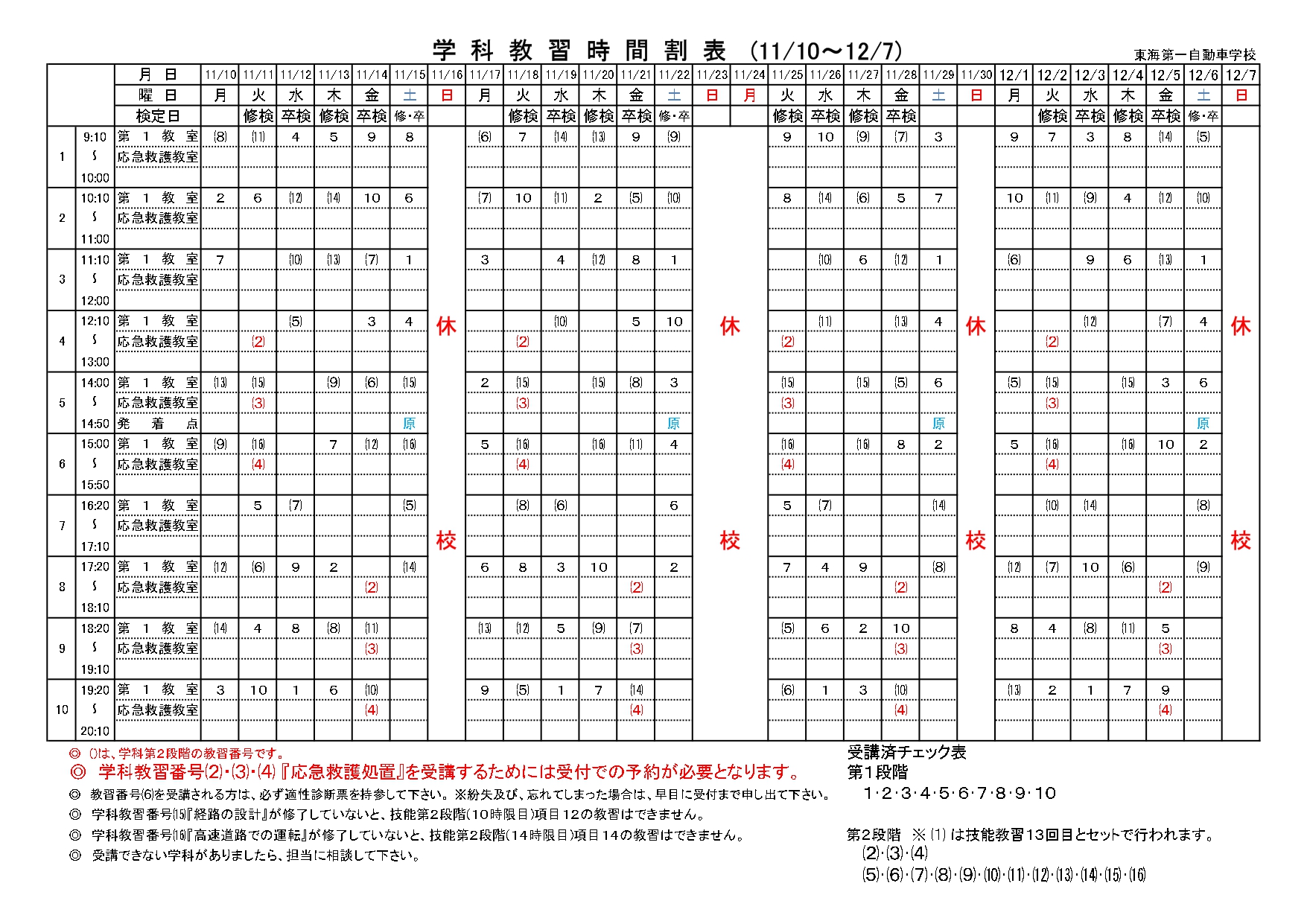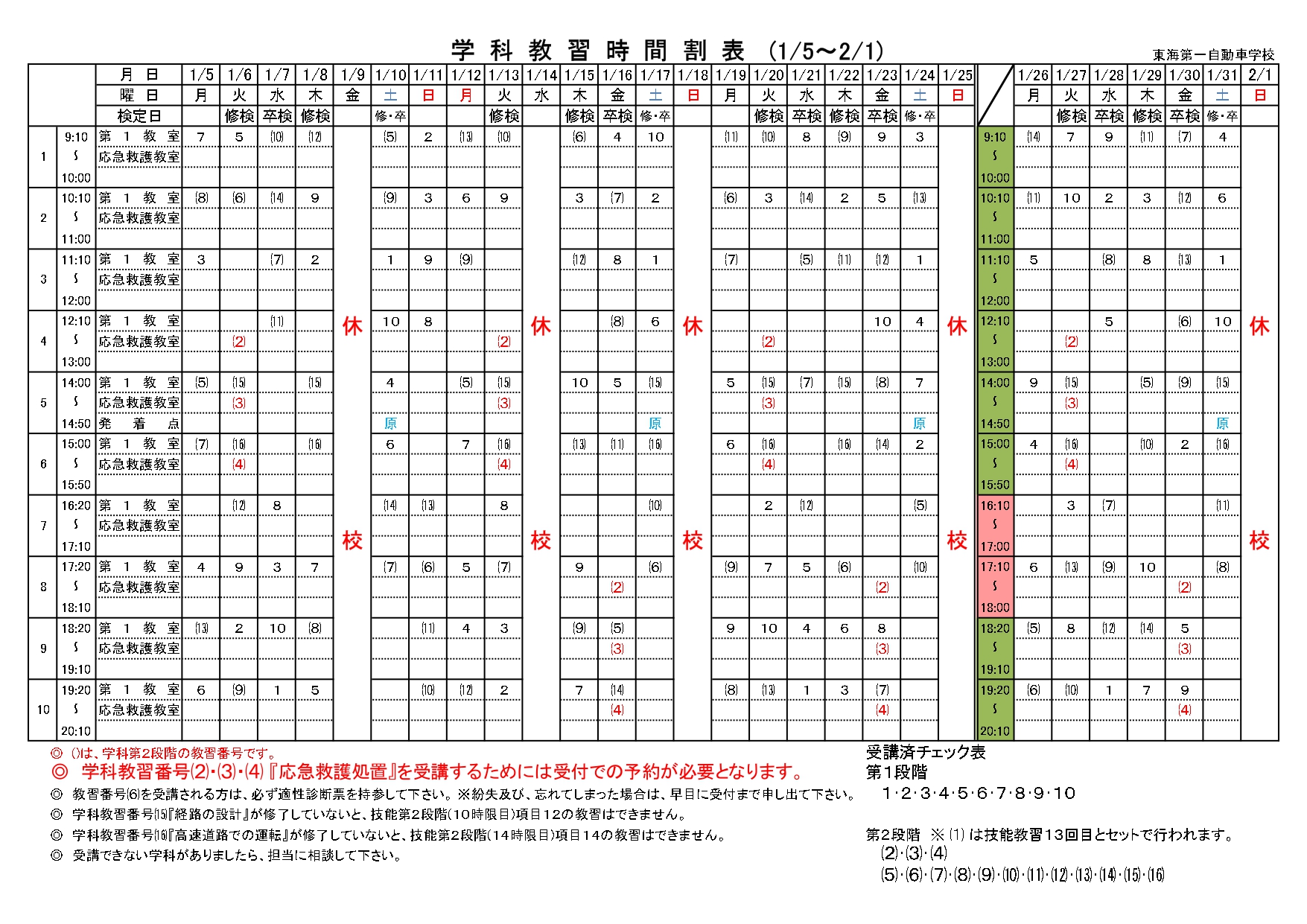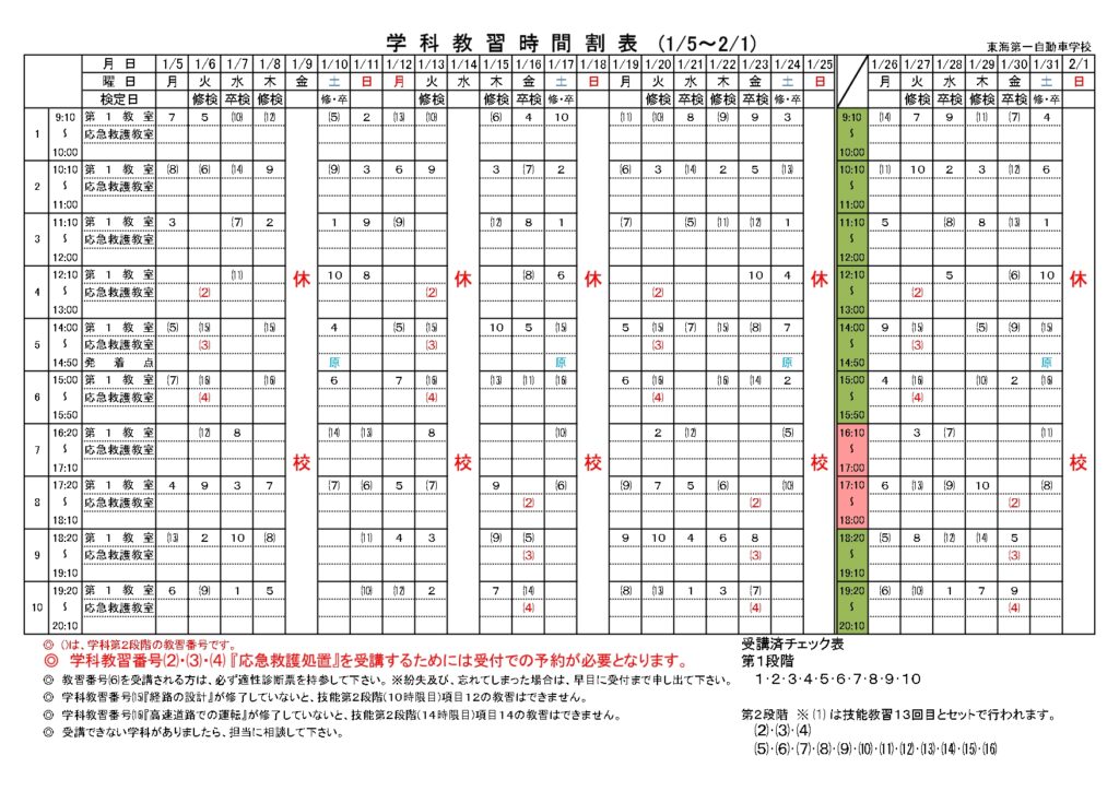 ◎学科教習番号(2)(3)(4)「応急救護処置」を受講するためには受付での予約が必要となります。
